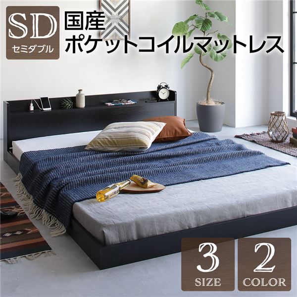 ベッド セミダブル 国産ポケットコイルマットレス付き ヴィンテージ ブラック 低床 棚付き 宮付き 宮棚付き コンセント付き すのこ フロアベッド ローベッド 低床ベッド すのこベッド すのこベット ローベット フロア ベット セミダブルベッド セミダブルベット