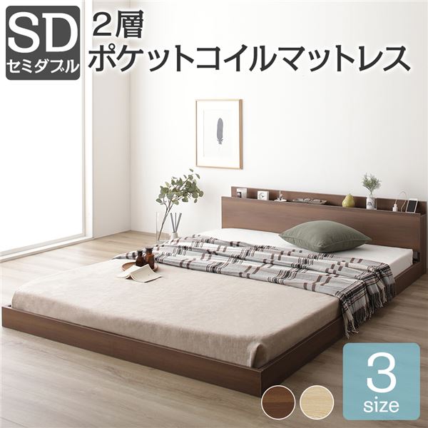 ベッド セミダブル 2層ポケットコイルマットレス付き ブラウン 低床 すのこ 棚付き 宮付き 宮棚付き 2口 コンセント付き ローベッド フロアベッド 低床ベッド すのこベッド すのこベット ローベット フロア ベット セミダブルベッド セミダブルベット