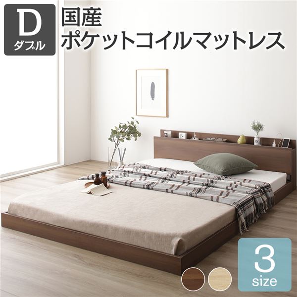 ベッド ダブル 国産ポケットコイルマットレス付き ブラウン 低床 すのこ 棚付き 宮付き 宮棚付き 2口 コンセント付き ローベッド フロアベッド 低床ベッド すのこベッド すのこベット ローベット フロア ベット ダブルベッド ダブルベット