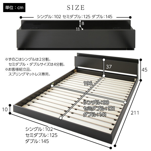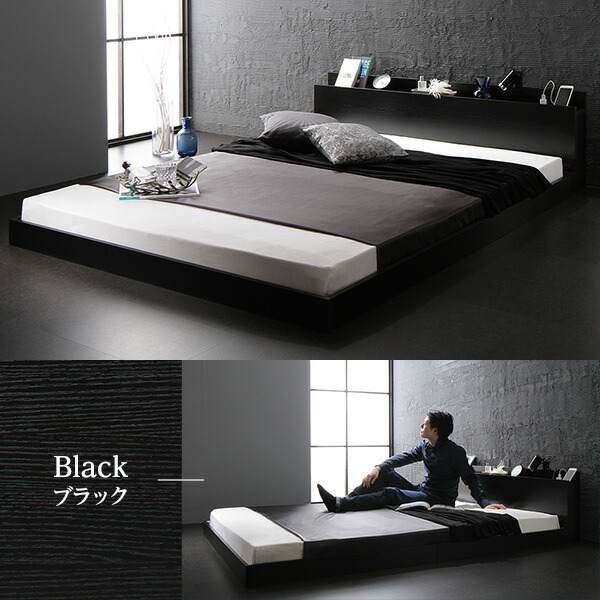 ベッド シングル 2層ポケットコイルマットレス付き ブラック 低床 すのこ 棚付き 宮付き 宮棚付き 2口 コンセント付き ローベッド フロアベッド 低床ベッド すのこベッド すのこベット ローベット フロア ベット シングルベッド シングルベット