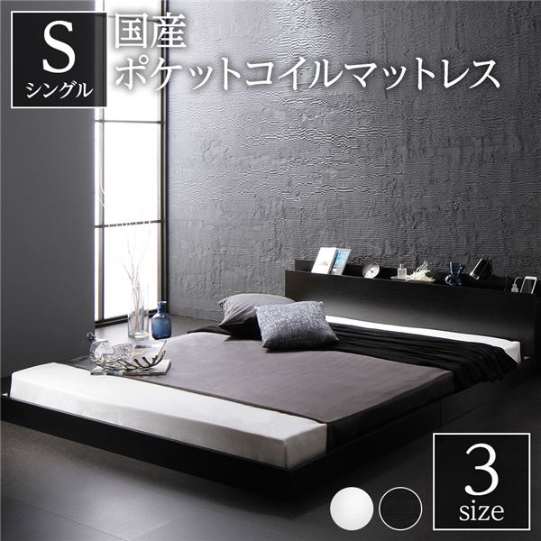 ベッド シングル 国産ポケットコイルマットレス付き ブラック 低床 すのこ 棚付き 宮付き 宮棚付き 2口 コンセント付き ローベッド フロアベッド 低床ベッド すのこベッド すのこベット ローベット フロア ベット シングルベッド シングルベット