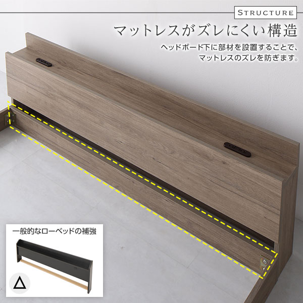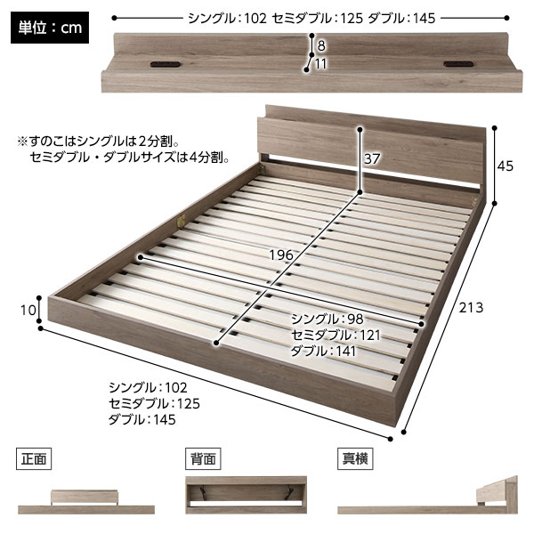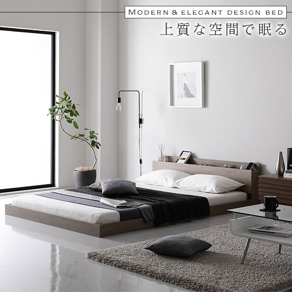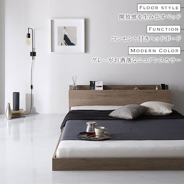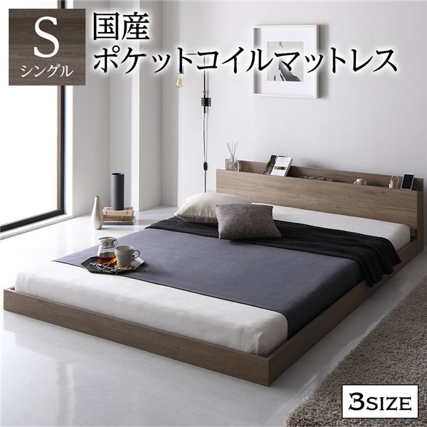 ベッド シングル 国産ポケットコイルマットレス付き グレージュ 低床 すのこ 棚付き 宮付き 宮棚付き 2口 コンセント付き ローベッド フロアベッド 低床ベッド すのこベッド すのこベット ローベット フロア ベット シングルベッド シングルベット