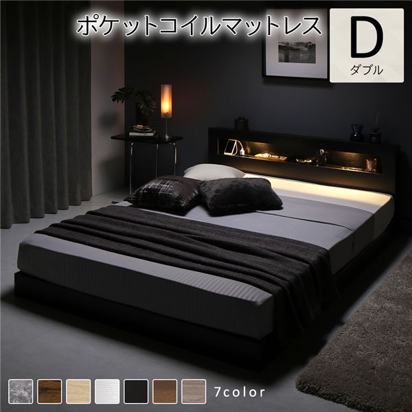 ベッド ダブル ポケットコイルマットレス付き ブラック 低床 LED 照明付き 宮付き 棚付き 宮棚付き 2口 コンセント付き すのこ 頑丈 ローベッド フロアベッド 低床ベッド すのこベッド すのこベット ダブルベッド ダブルベット