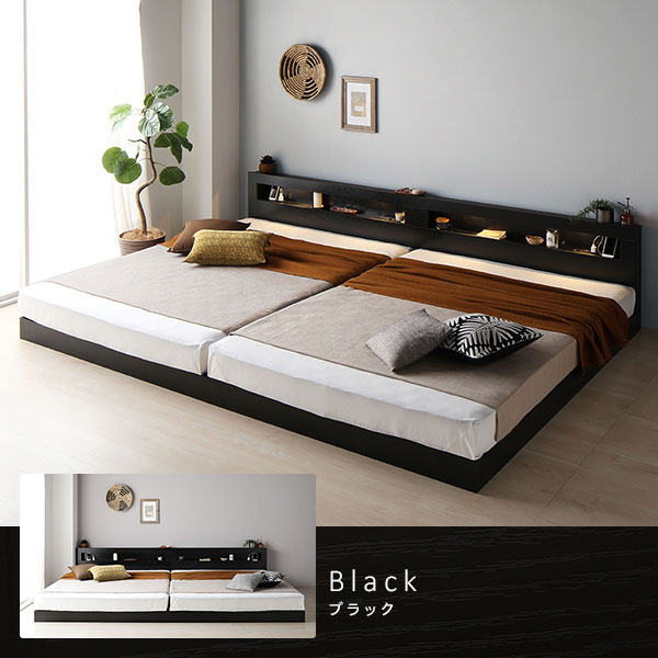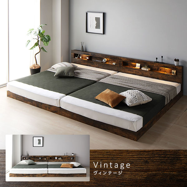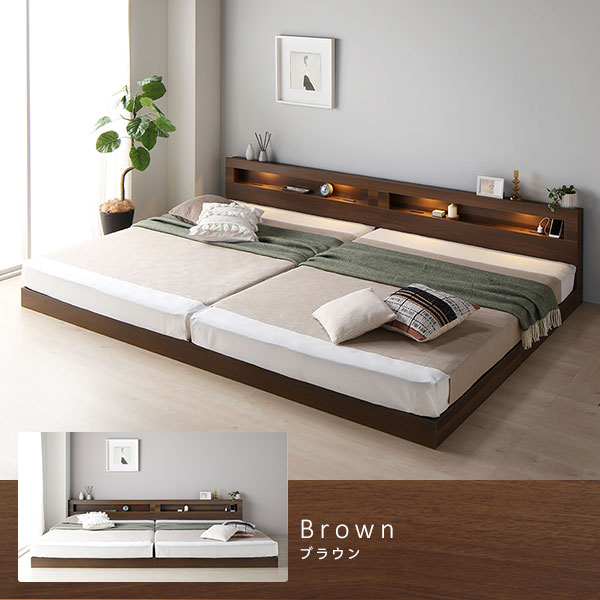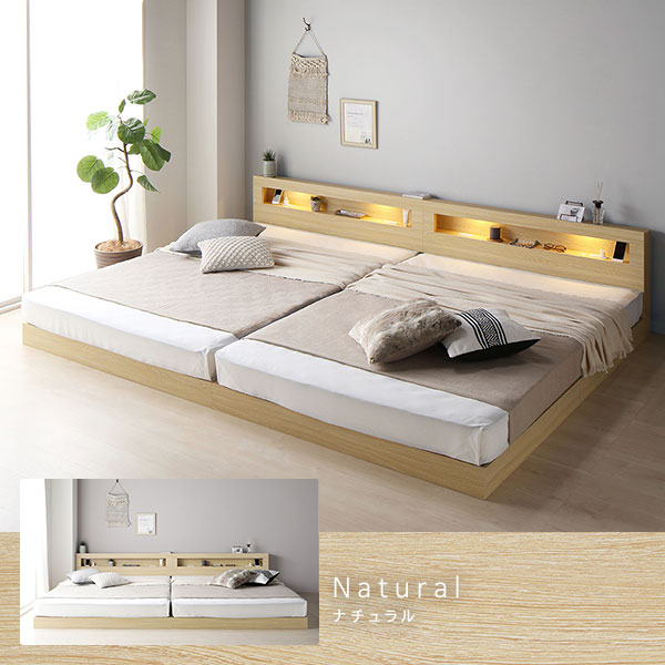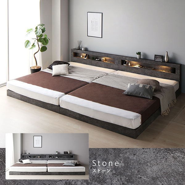 ベッド ワイドキング 280(D+D) 2層ポケットコイルマットレス付き ストーングレー 連結 低床 LED 照明付 宮付 棚付き 宮棚付き 2口 コンセント付き すのこ 頑丈 ローベッド フロアベッド 低床ベッド すのこベッド すのこベット ワイドキングベッド ワイドキングベット