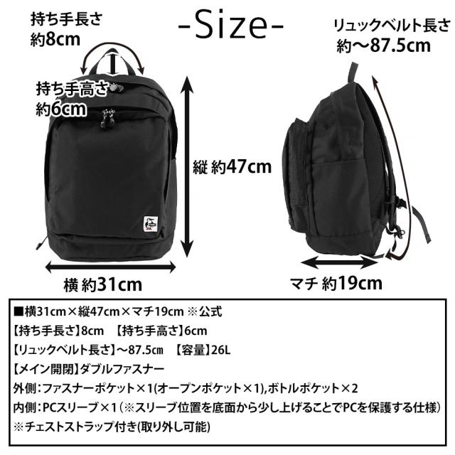 | サイズ(約) ※当店実寸値 | 公式サイズ 横31cm×縦47cm×マチ19cm 【持ち手長さ】約8cm 【持ち手高さ】約6cm 【リュックベルト長さ】〜87.5cm 【容量】26L | ||