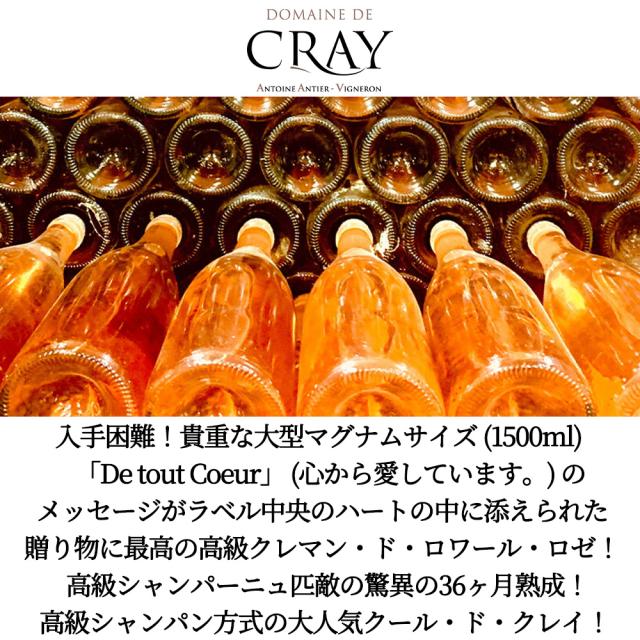 手困難!貴重な大型マグナムサイズ(1500ml) 「De tout Coeur」(心から愛しています。)の メッセージがラベル中央のハートの中に添えられた 贈り物に最高の高級クレマン・ド・ロワール・ロゼ! 高級シャンパーニュ匹敵の驚異の36ヶ月熟成! 高級シャンパン方式の大人気クール・ド・クレイ!