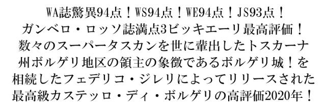 WA誌驚異94点!WS94点!WE94点!JS93点! ガンベロ・ロッソ誌満点3ビッキエーリ最高評価! 数々のスーパータスカンを世に輩出したトスカーナ 州ボルゲリ地区の領主の象徴であるボルゲリ城!を 相続したフェデリコ・ジレリによってリリースされた 最高級カステッロ・ディ・ボルゲリの高評価2020年!