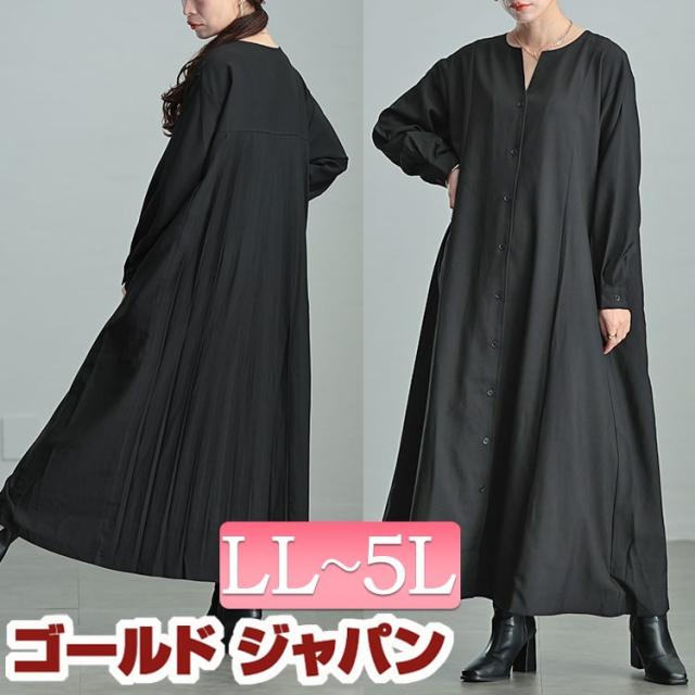 春新作 大きいサイズ レディース ワンピース バックプリーツキーネックシャツワンピース ワンピ ロングワンピース ロング 長袖 シャツ キーネック プリーツ バックプリーツ フレア Aライン ストレッチ 伸縮 秋服 冬服 春服 LL 2L 3L 4L 5L ブラック 黒 ゴールドジャパン