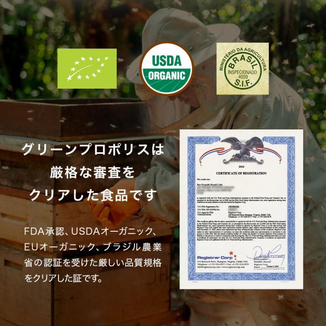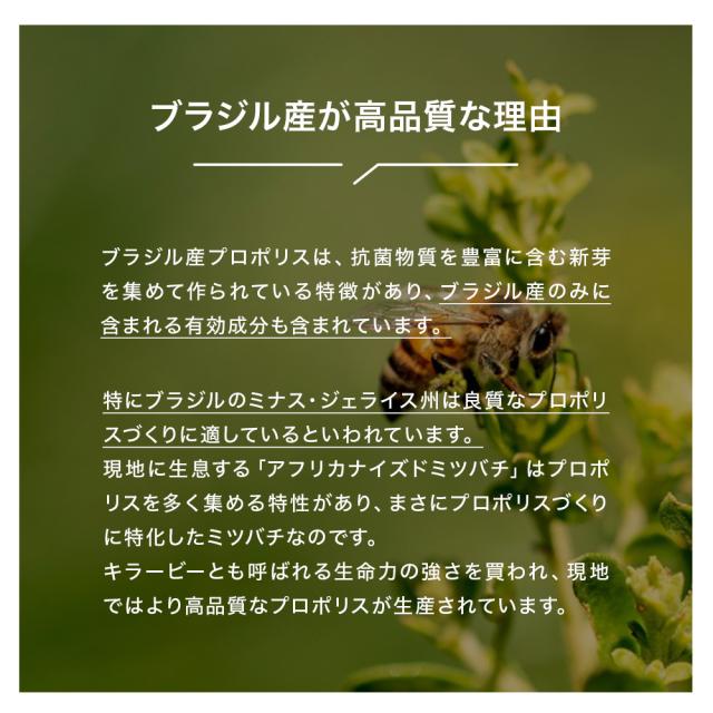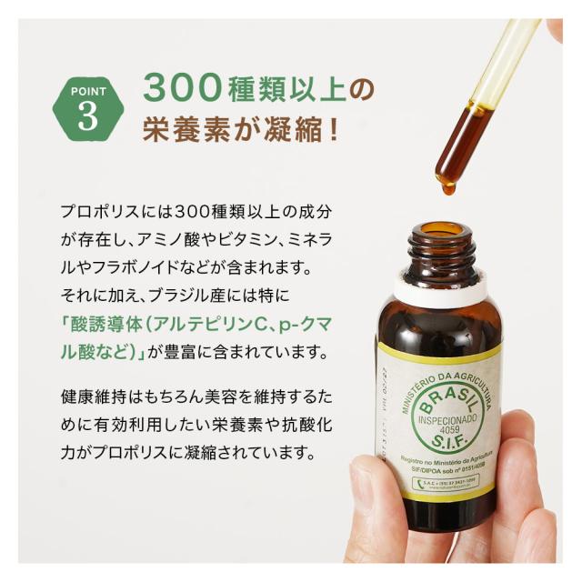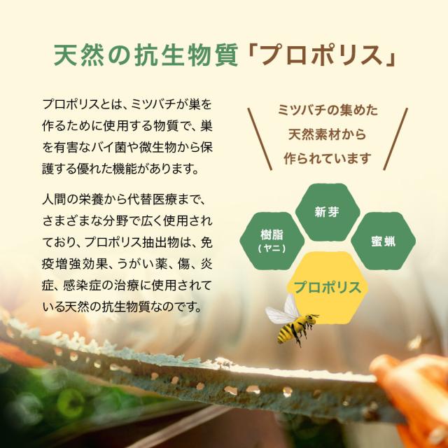 | 原材料名 | プロポリス、穀物中性アルコール、乾燥抽出物: 最低 20% (m/v) |