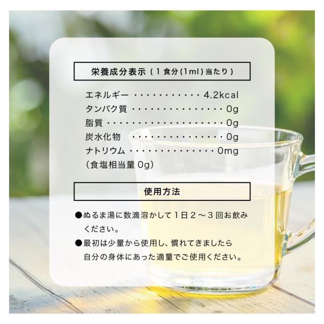 エネルギー・・・・・4.2 Kcal 炭水化物・・・・・・0 g 脂質・・・・・・・・0 g タンパク質・・・・・0 g ナトリウム・・・・・0 mg |