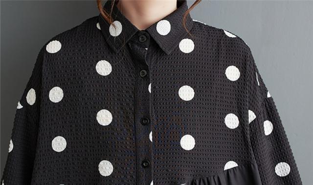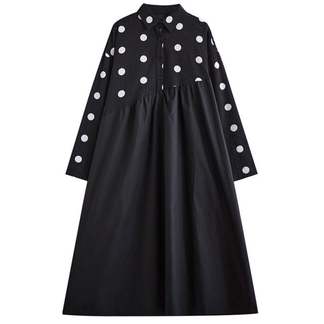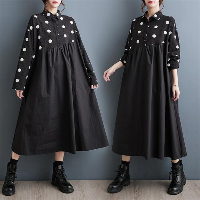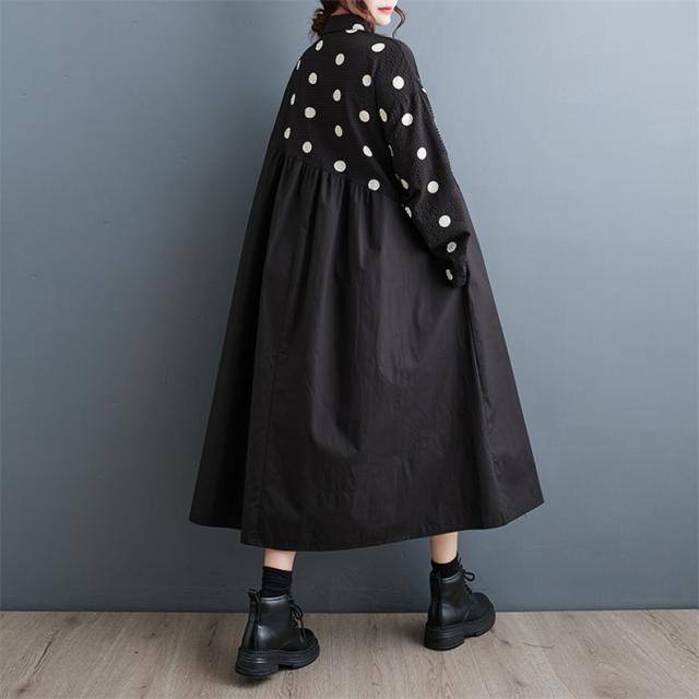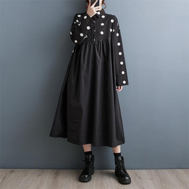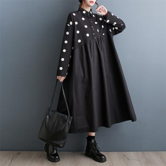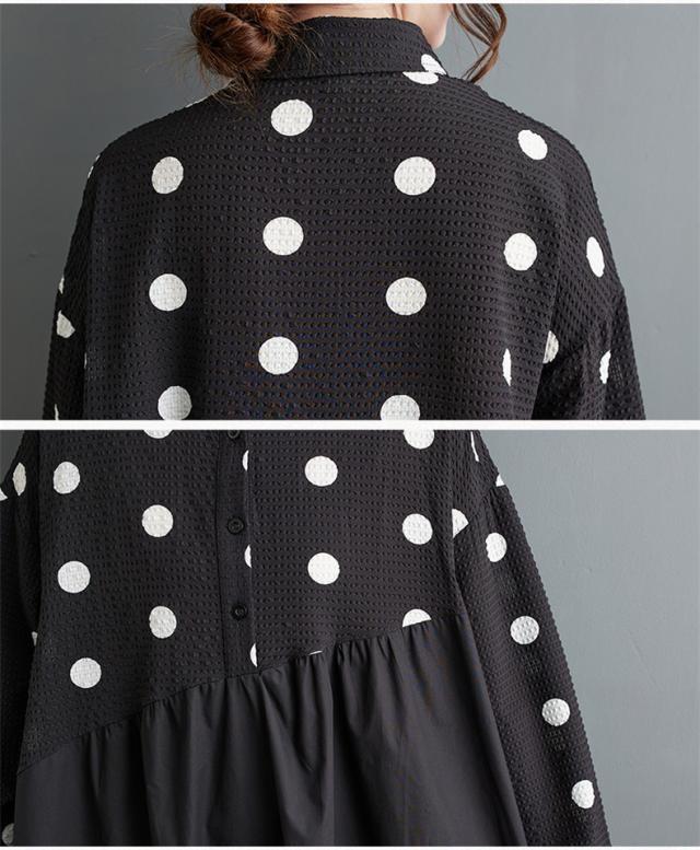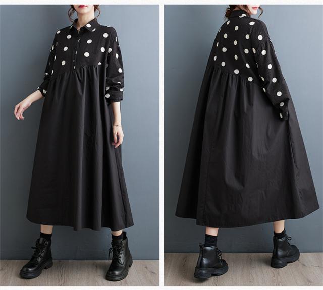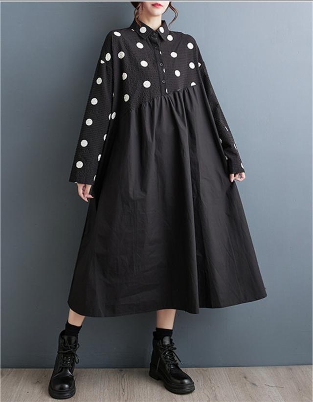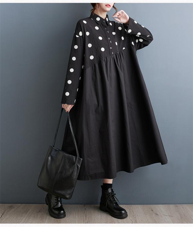 ワンピース 秋 レディース 長袖 切り替え ゆったり ドット柄 ポロカラー エレガントなシルエット 落ち着いた大人コーデに 体型カバーしつつきれい見え