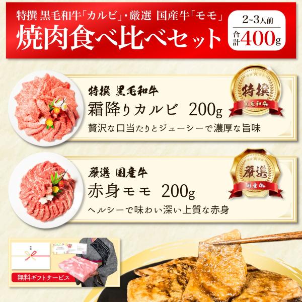 焼肉 セット お肉 ギフト 特撰 黒毛和牛 霜降り カルビ & 国産 牛 赤身 モモ 各200g 計400g 食べ比べ 肉 5000円 のし 名入れ プレゼント 牛肉 焼き肉 高級 食べ物 和牛 誕生日 内祝い お返し 送料無料 早割 御礼 お歳暮 御歳暮 お年賀