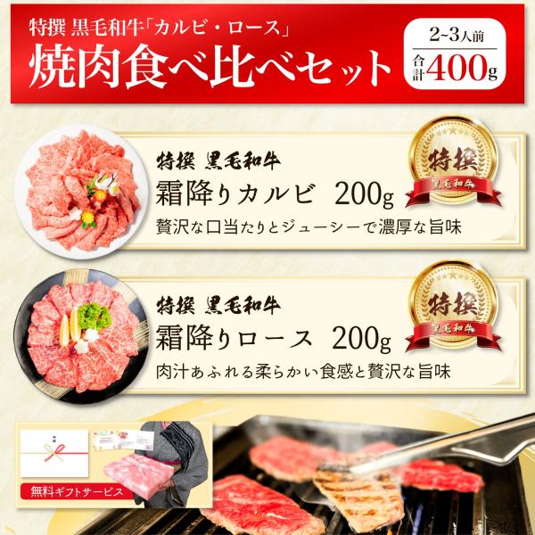 焼肉 セット 食べ比べ 特撰 国産 黒毛和牛 霜降り カルビ & ロース 各200g 計400g お肉 肉 ギフト 6000円 のし 名入れ 牛肉 焼き肉 やきにく 材料 牛 高級 食べ物 食品 和牛 誕生日 内祝い お返し 送料無料 早割 BBQ お礼 お歳暮 御歳暮 お年賀