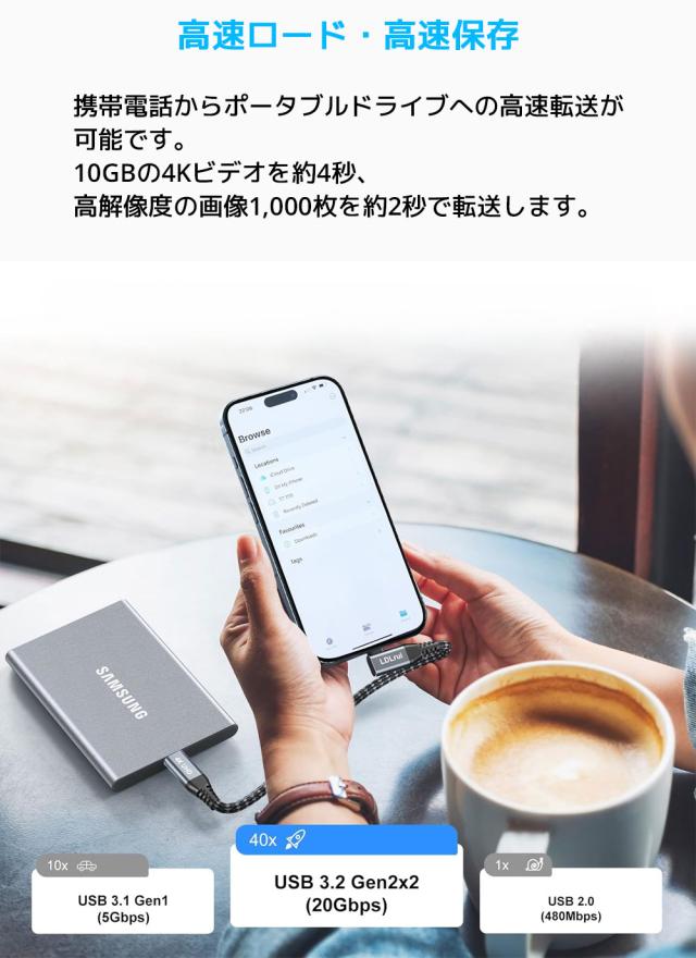 このケーブル1本で充電、20Gbpsの速度でのデータ転送、4K ビデオ同期、