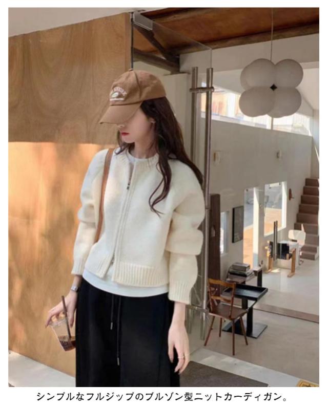 | シンプルなフルジップのブルゾン型ニットカーディガン。 首元はクルーネックデザインで、すっきりとした印象で着れます。 短めのショート丈感はハイウエストのボトムとの相性抜群です! ゆったりとしたサイズ感、肩落ちでラフに。程よい丈感で、バランスよく着られます。 開け閉め自由なジップアップ仕様で、気分によって印象が変わる優れもの。 型崩れしにくいスポンディッシュニットは体のラインを拾いにくく、さっと着るだけで体型カバーにも。 ロンTはもちろん、シャツ、ブラウス、トレンドのシアーハイネックトップスなどとのレイヤードコーデもおすすめです。 | |