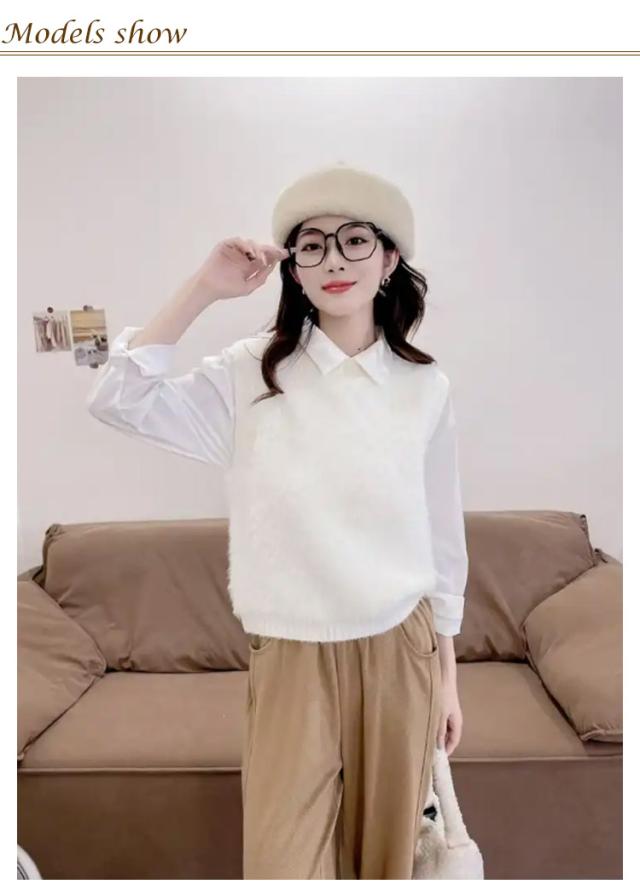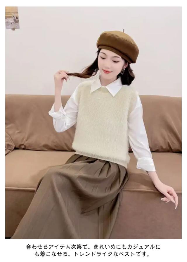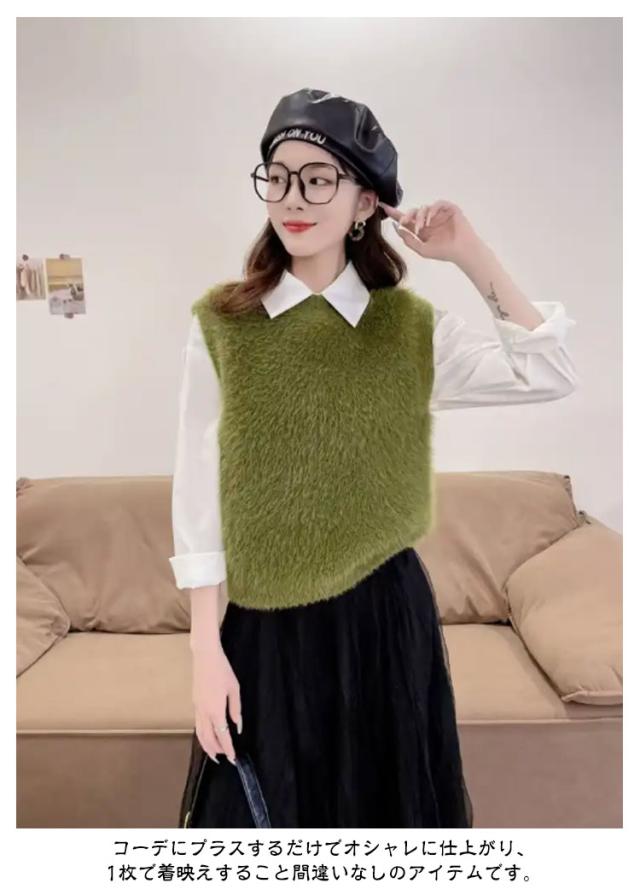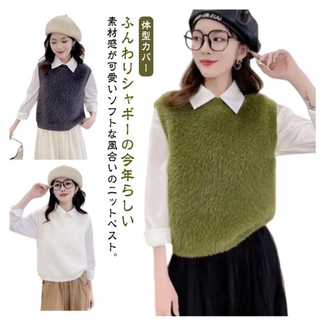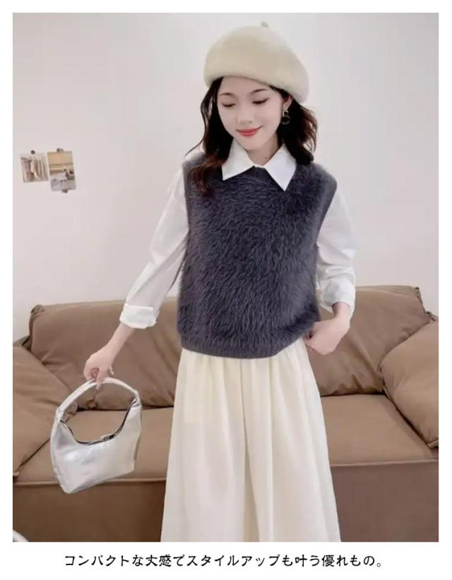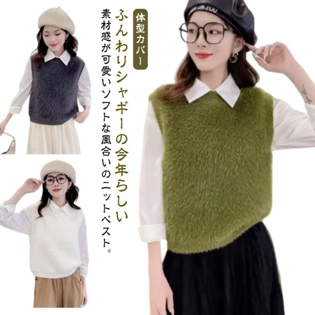 Uネック シャギーベスト レイヤード シャギーニット ニットベスト モヘア ニット セーター レディース シャギー ニットベスト トレンド トップス 長毛 ベスト プルオーバー 秋冬 ノースリーブ おしゃれ きれいめ 黒 ブラック