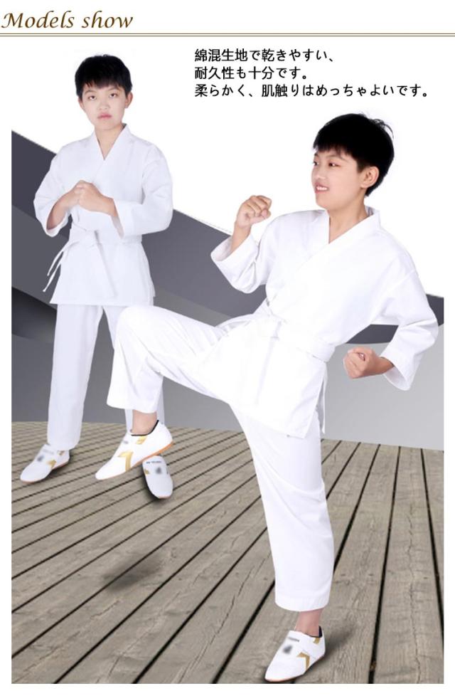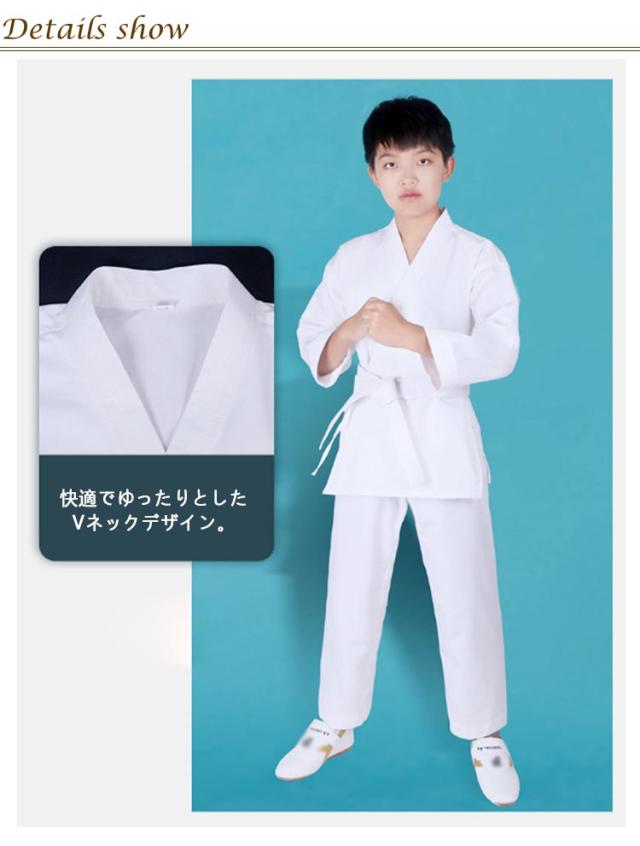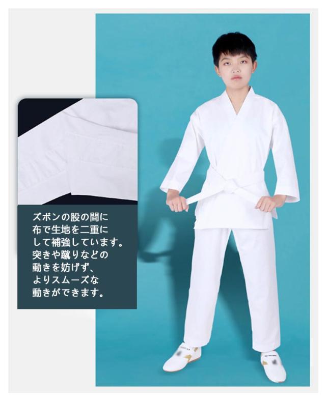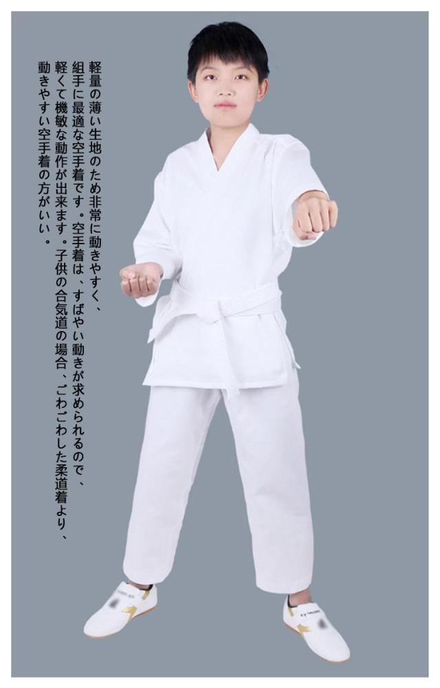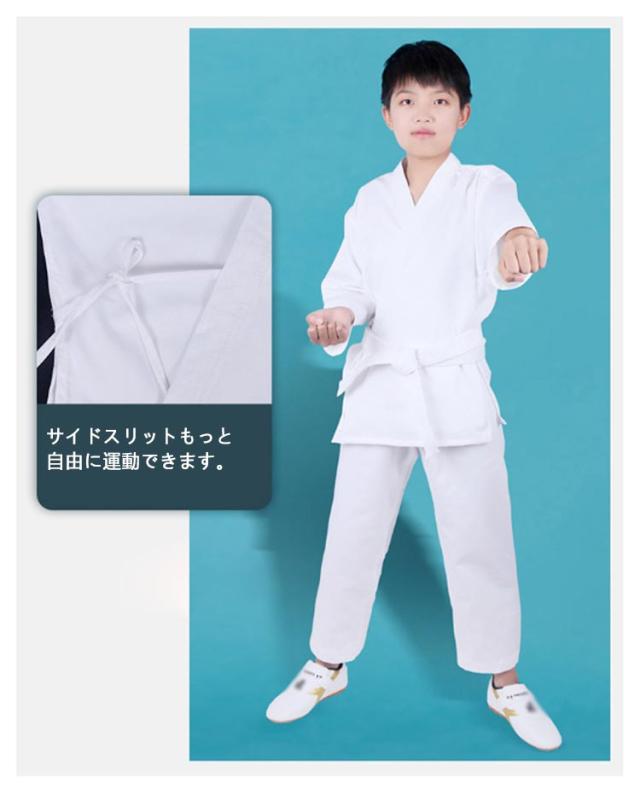 | 子供〜大人 100-180cm 上下白帯3点セット ポリエステル・綿混紡生地 綿混生地で乾きやすい、耐久性も十分です。柔らかく、肌触りはめっちゃよいです。 軽量の薄い生地のため非常に動きやすく、組手に最適な空手着です。空手着は、すばやい動きが求められるので、軽くて機敏な動作が出来ます。子供の合気道の場合、ごわごわした柔道着より、動きやすい空手着の方がいい。 トレーニング、ボクシング、ムエタイ、テコンドー、スパーリング、パンチ、相撲やジム用に使用できます。 白帯付きなので初心者におすすめです。初心者、小学生、中高生、道場練習用! <details> ●快適でゆったりとしたVネックデザイン。 ●袖口はしっかりと縫製されています。 ●サイドスリットもっと自由に運動できます。 ●調節可能な伸縮性のあるウエストゴム。 ●ズボンの股の間に布で生地を二重にして補強しています。突きや蹴りなどの動きを妨げず、よりスムーズな動きができます。 | |