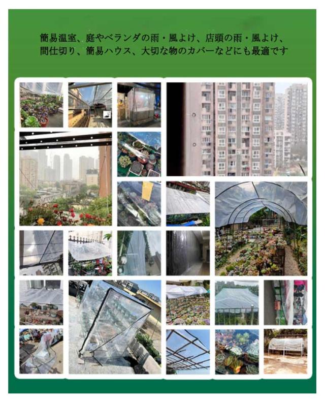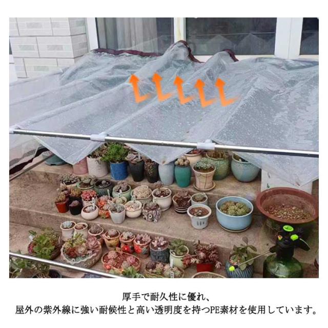 | 防水透明シート 雨よけ/防塵/防風/防寒 2x8cm 厚手で耐久性に優れ、屋外の紫外線に強い耐候性と高い透明度を持つPE素材を使用しています。 覆っても中が見えやすいのが特長 簡易温室、庭やベランダの雨・風よけ、店頭の雨・風よけ、間仕切り、簡易ハウス、大切な物のカバーなどにも最適です ハトメ付きで取付け・取外しが簡単。 | |