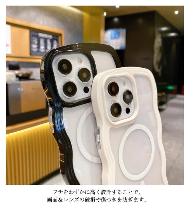 | 気分を盛り上げて大人可愛いのウェーブデザインケースが登場。 衝撃吸収性に優れたTPU素材を採用し、柔軟性があって、着脱しやすい設計になっています。 存在感のあるうねうねケースで、手に馴染んで快適な持ち心地。 軽量かつ薄型な作りで、フィット感が抜群、ポケットやカバーに入れても持ち歩きやすい。 フチをわずかに高く設計することで、画面&レンズの破損や傷つきを防ぎます。 MagSafe充電対応で差し込みのいらない超簡単・超高速充電を実現しています。 | |