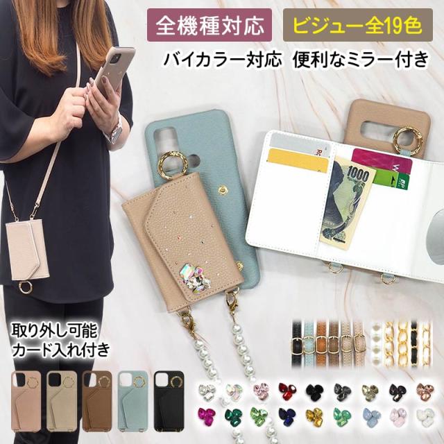 スマホケース ハード 全機種【レザー×カード入れ ロングストラップ付き×ビジュー&フラットストーン】メール便送料無料 受注生産