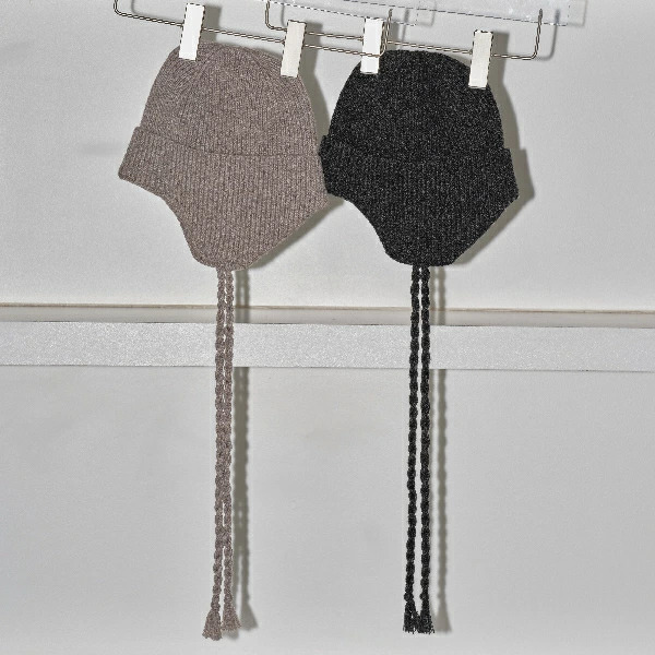 イヤーフラップから垂れる同じ糸で編まれたヒモや、ビーニーを折り上げたようなディテールが目を惹くアイテム。