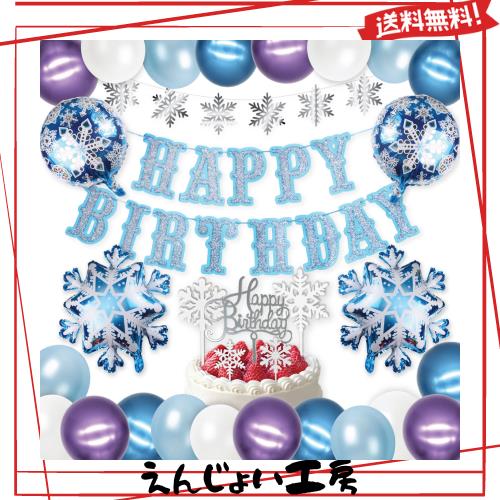 ?【セット内容】?スノーフレイク・アルミバルーン x2 ?ラウンド・アルミバルーン x2 ?ゴムバルーン:メタリックパープル x5、ホワイト x5、パープル x5、ライトブルー x5、メタリックブルー x5 ?「Happy Birthday」レターバナー x1 ?スノーフレイク・ガーランド x1 ?ケーキトッパーセット x1 ?その他アクセサリー:アレンジテープ x1、ストロー x2、両面シールセット x1(接着ドット20個)
