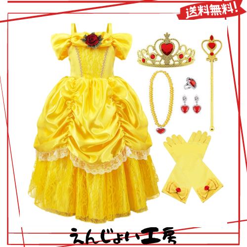 [CQDY] プリンセスドレス 子供用 ベルドレス キッズ (美女と野獣風ドレス+ティアラなど) 豪華7点セット 100-140cm キッズコスチューム