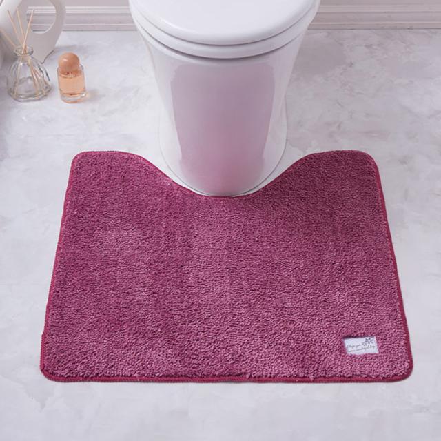 どんなトイレのインテリアにも合わせやすい無地のワイン色トイレマット&蓋カバー。右端のタグがワンポイント。トイレマットは、程よい毛足で手触り良いカットパイル仕上げ。しっかりした踏み心地で足触り気持ち良い。