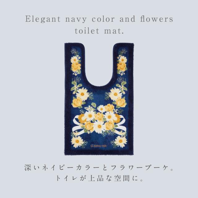 シックでエレガントなネイビーカラー。ウェディングブーケをイメージした華やかなフラワーのデザイン。ホワイトとイエローのお花がトイレ空間を明るくします。