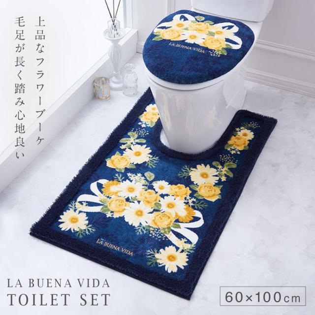 トイレマット フタカバーセット 2点セット 60×100cm 耳長ロング トイレ フタカバー 蓋 カバー すべらない 滑り止め 洗える 高級 花柄 おしゃれ 耳長ロングトイレマット・フタカバーセット ブエナヴィーダブーケ