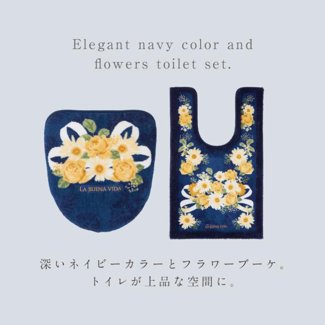 シックでエレガントなネイビーカラー。ウェディングブーケをイメージした華やかなフラワーのデザイン。ホワイトとイエローのお花がトイレ空間を明るくします。