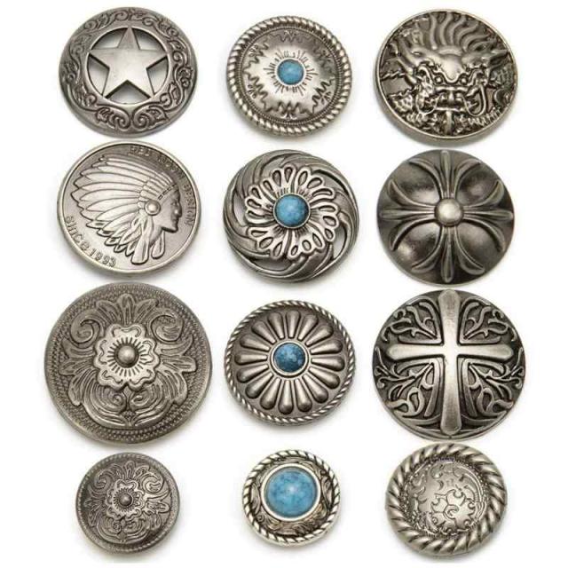 コンチョ ボタン 12個セット ねじ式 アンティーク シルバー 20mm〜33mm ターコイズ 唐草 インディアン 龍 五芒星 さくら レザークラフト 財布 手芸