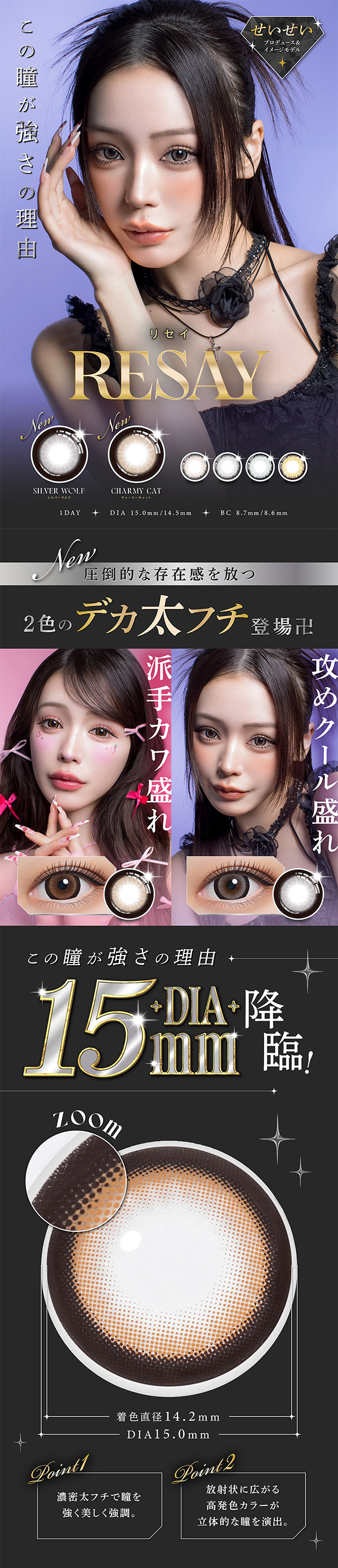カラコン ワンデー 度あり 度なし RESAY リセイ せいせい 田向星華 DIA14.5mm 15.0mm BC8.6 1箱10枚入り 高発色 フチあり ハーフ系 高度数 ハイパワー