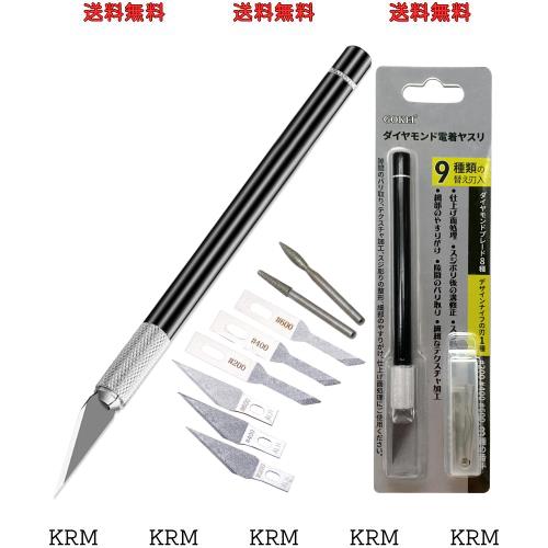 ■【パッケージ内容】 ・ヤスリ本体ホルダー *1本 ※2.35mm軸用コレットの装着サイズ(目安):2.1~2.5mm軸 ・刃9枚(9種類の替え刃入) ダイヤモンドブレード8種(三角・丸型)+デザインナイフの刃1種 1.角度23°(#200)×1枚 2.角度23°(#400)×1枚 3.角度23°(#600)×1枚 4.角度45°(#200)×1枚 5.角度45°(#400)×1枚 6.角度45°(#600)×1枚 7.丸型?(刃の長さ:9mm) ×1枚 8.丸型?(刃の長さ:9mm) ×1枚 9.デザインナイフの刃 ×1枚 ※普段は見えませんがブレードに番手(粒度の異なる刃)が刻印されています。 ・ケース(刃を入れる用) *1 ・キャップ *1