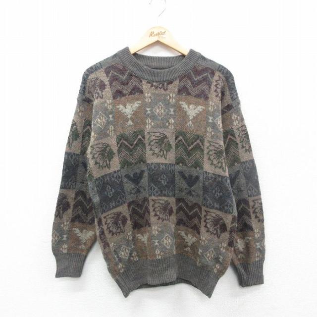 古着 長袖 セーター メンズ 90年代 90s アーガイル シェットランドウール クルーネック ベージュ他 カーキ Mサイズ 中古 ニッ 中古 古着