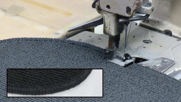 外周はスッキリと美しく見せる為、屋内高級ラグマットやカーペットにも採用される「オーバーロック加工」を施しています。熟練の職人による手作業で一つ一つ丁寧に縫いあげられます。