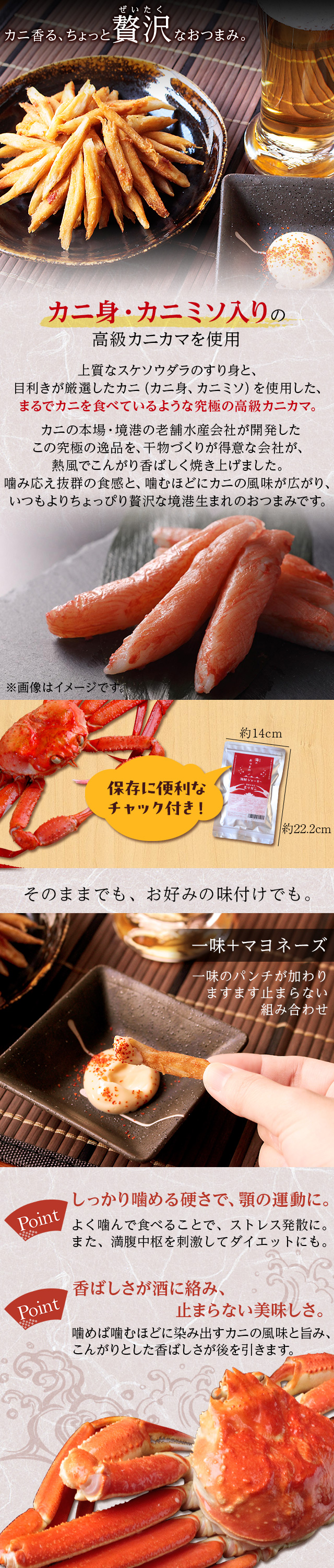 上質なスケソウダラのすり身と、厳選したカニ身とカニミソを使用し、熱風でこんがり香ばしく焼き上げました。噛み応え抜群の食感と、?むほどにカニの風味が広がり、いつもよりちょっぴり贅沢なおつまみです。