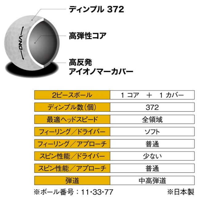 ボール全体を柔らかくし、ドライバースピンを低減。強い弾道を生むディンプル 372との組み合わせで大きな飛びを生み出します。