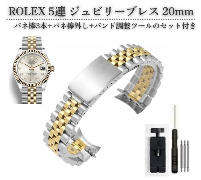 20mm 汎用 5連 ジュビリー ブレスレット SS ステンレス 腕時計 ベルト バンド 弓カン デイトジャスト、デイトナ、サブマリーナ、GMTマスターII など 全3色 コンビネーションゴールド