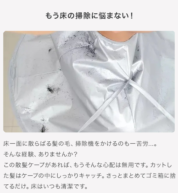 ケープを広げて装着するだけで、カットした髪の毛をしっかりキャッチ。 掃除の手間を大幅に削減できます。