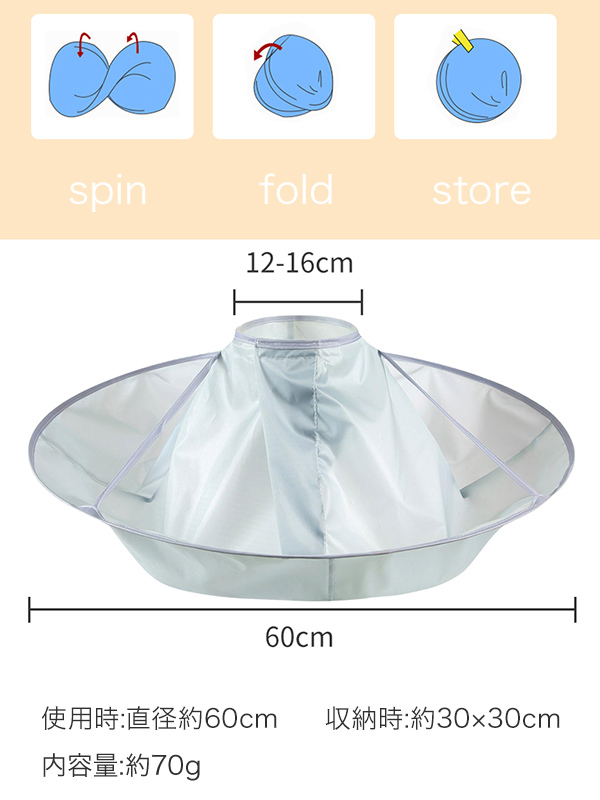 直径約60cmのゆったりサイズと首元の調節機能で、 ショートヘアからロングヘアまで、どんなヘアスタイルでも安心。