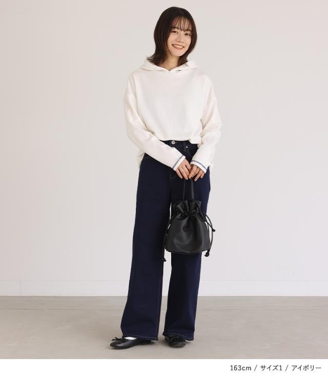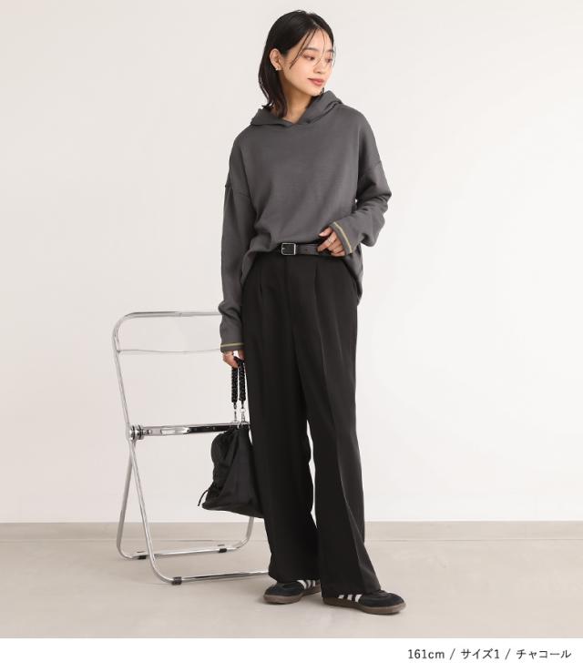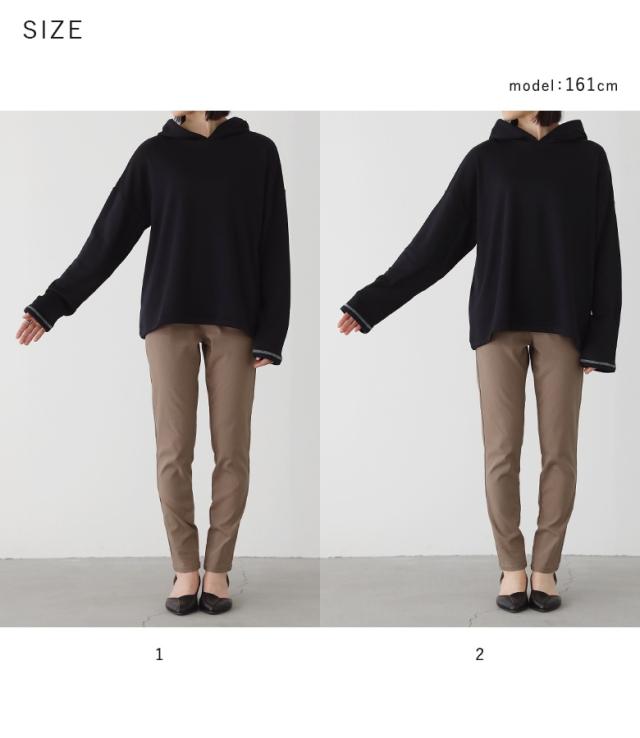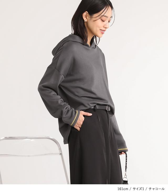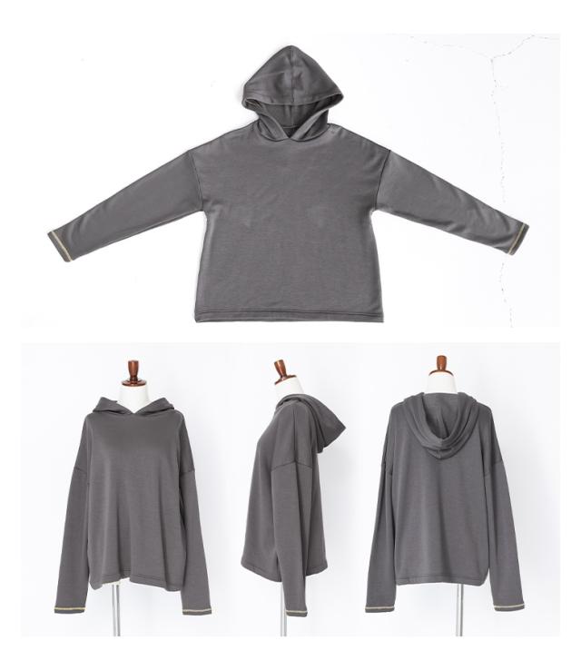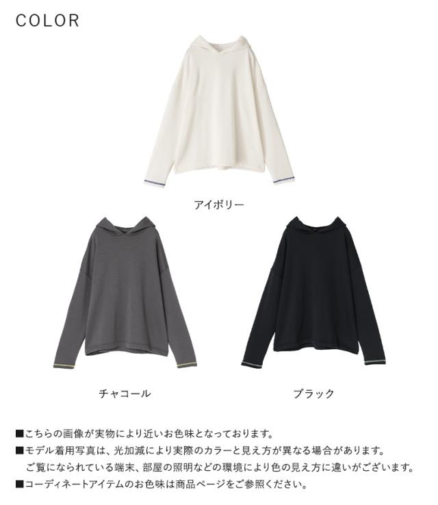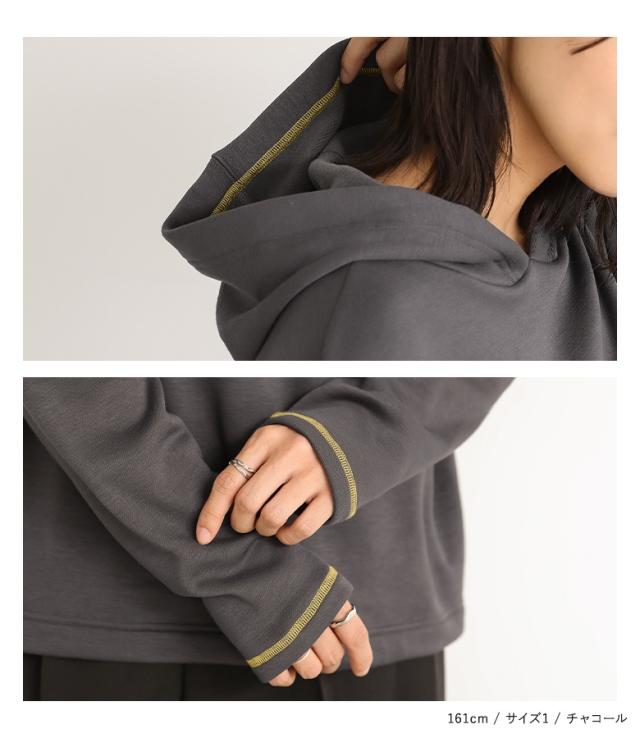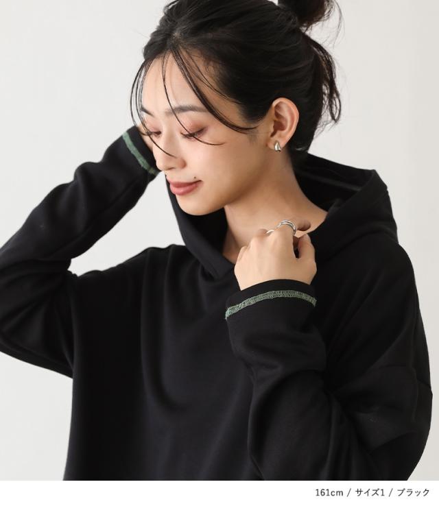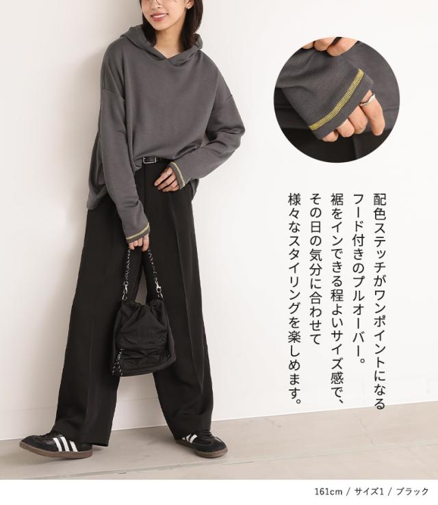 『配色ステッチ裏起毛フードプルオーバー【メール便不可】【20】[カットソー 長袖 レディース トップス パーカー フード付き フーディー 裏起毛 あったか 配色 ステッチ インナー ドロップショルダー]