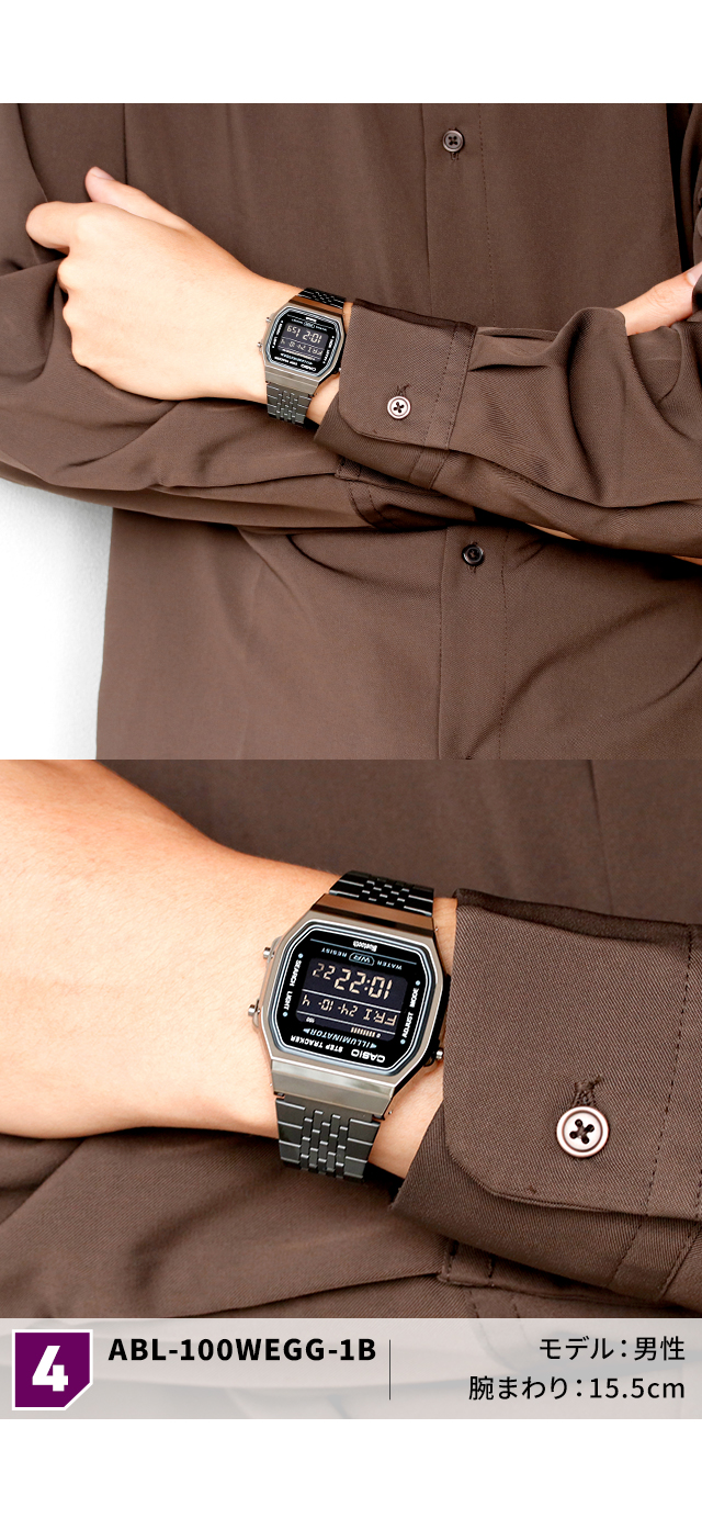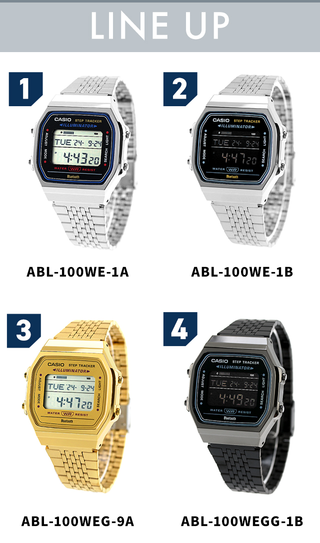2月末入荷予定予約受付中 7年保証キャンペーン カシオ CASIO クオーツ Bluetooth メンズ 腕時計 ABL-100W デジタル ブラック 選べるモデル ◆角型フォルムのクラシックデザインに、日常で役立つ機能を備えたモデルです。デジタル液晶のシンプルなケースに、細やかな輝きを放つ多列タイプのメタルバンドを採用し、腕馴染みのよいフラットなフォルムに仕上げました。センサーが体の動きを感知し、歩数を自動的にカウント。その日の歩数を液晶画面でお知らせします。また、Bluetoothでスマートフォンと連携し、時計の時刻を自動修正。時計の設定をスマホのアプリ上で簡単に設定できます。さらに、時計で計測した歩数データなどをアプリに転送。ライフログとして日々の健康管理に役立てられます。クラシカルなデザインと便利な機能で、ヘルスコンシャスな毎日をサポートします。 ABL-100WE-1ADF ABL-100WE-1BDF ABL-100WEG-9ADF ABL-100WEGG-1BDF