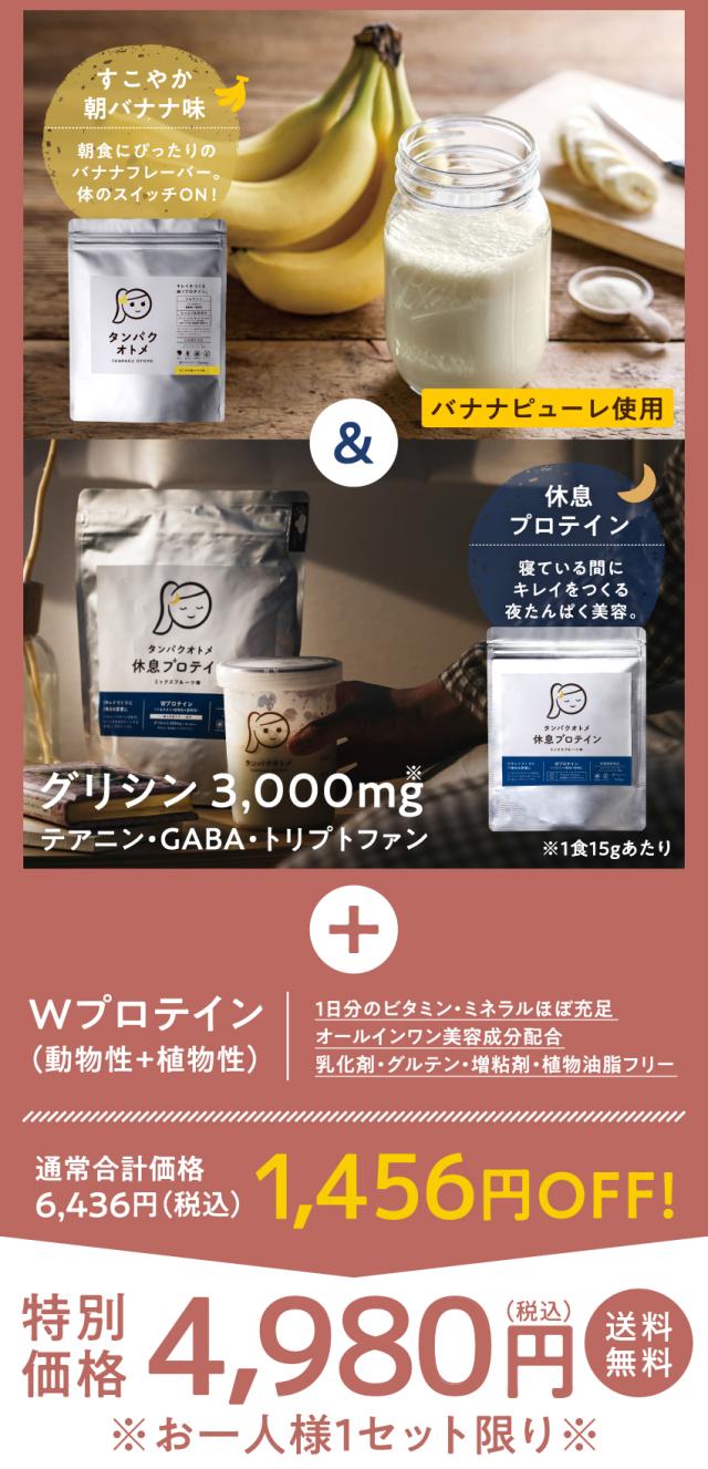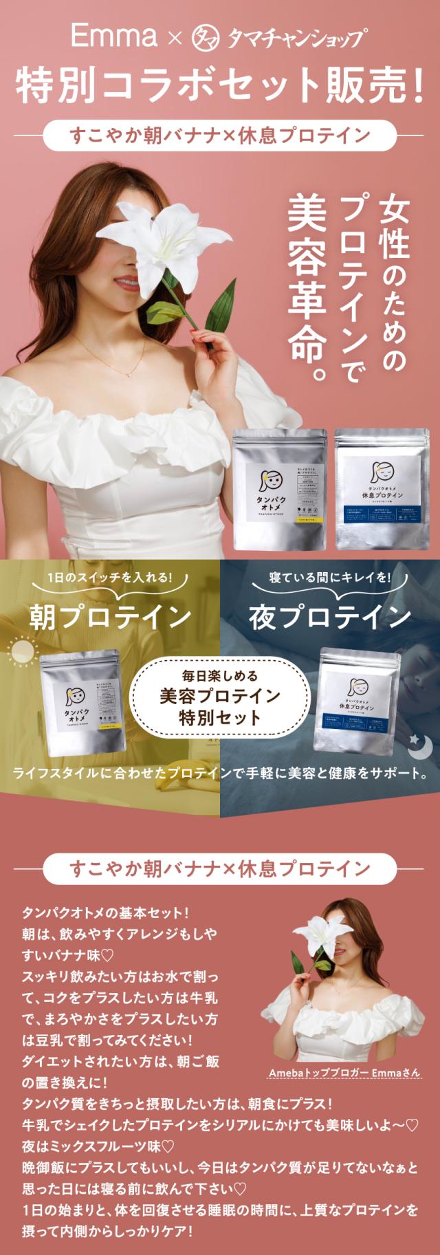 【Emmaさんコラボ】タンパクオトメ2袋セット(朝バナナ+休息プロテイン) ※セット内容は固定。※お一人様1セット限り【送料無料】ホエイ ソイ プロテイン W配合 タンパク質 美容成分 低糖質 植物性 サプリ 朝プロテイン シェイカー 砂糖不使用 ダイエット 健康 美容 話題