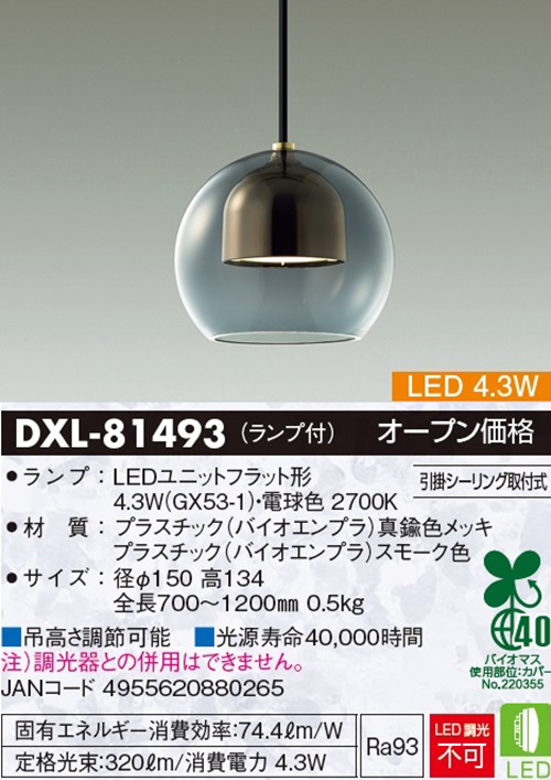 DXL-81493 LEDペンダントライト(ランプ付) 真鍮色メッキ・スモーク色 スペック情報