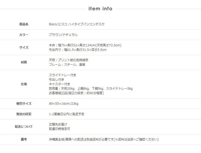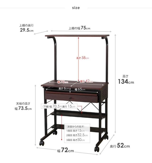 パソコンデスク ハイタイプ 幅75cm 棚付き ラック 引き出し キャスター付き 大型モニタ 収納 テレワーク 在宅 ワークデスク PCデスク 書斎机 勉強机 オフィス プリンター置き 省スペース おしゃれ 北欧 モダン ブラウン bisco iwp-65