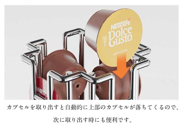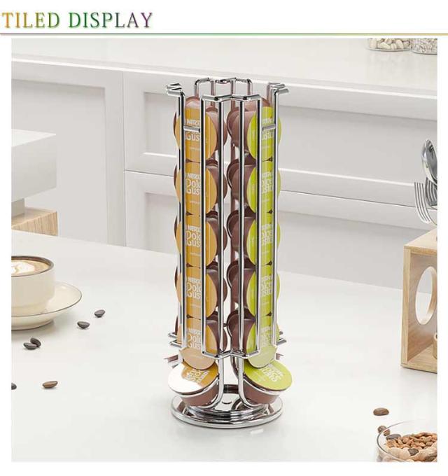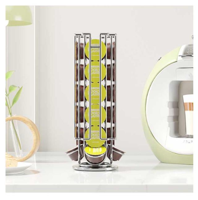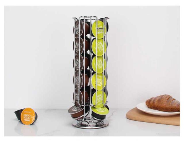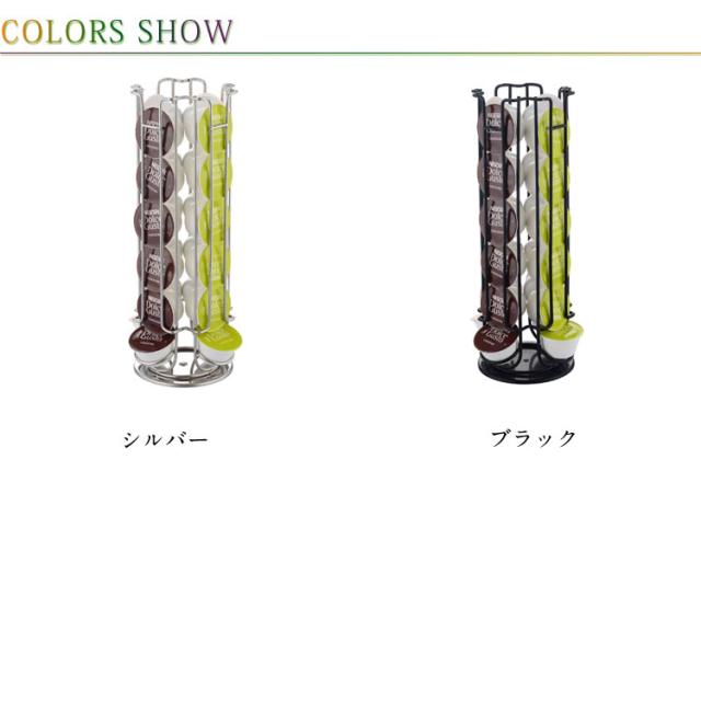 | コーヒーカプセルの収納に最適なタワー型ホルダーです。 360度回転するので選びやすく取りやすい構造です。 カプセルを取り出すと自動的に上部のカプセルが落ちてくるので、次に取り出す時にも便利です。 底面には滑り止めマットが付いているのでしっかりとカプセルスタンドを固定します。 縦型のデザインは場所を取らず、省スペースにたっぷり収納ができます。 | |