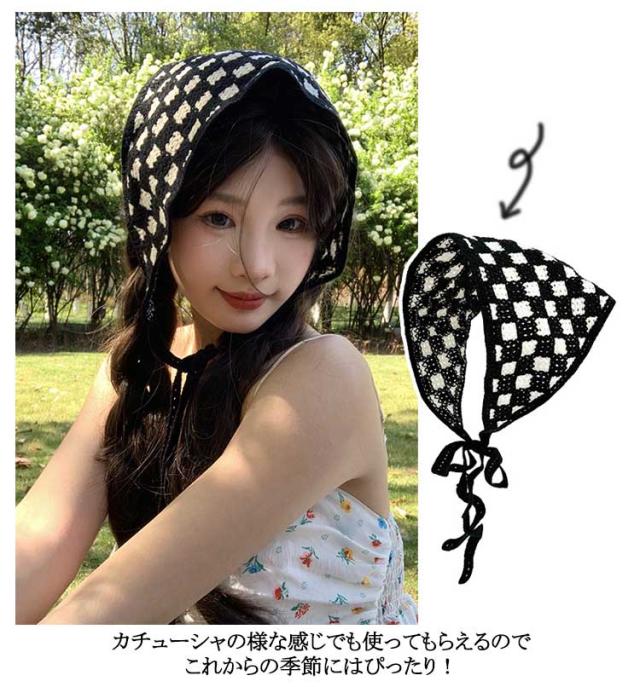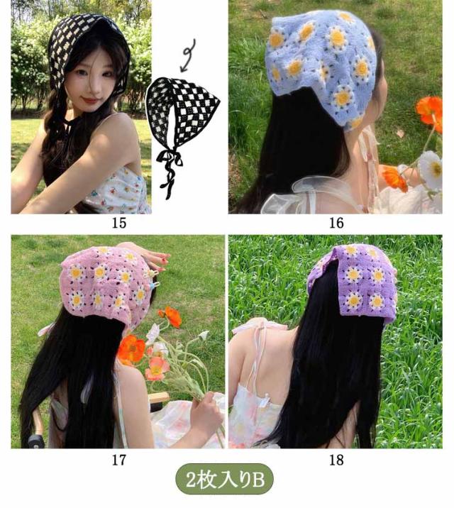 | 【2枚入り】【小顔効果抜群】 さっとかぶれて簡単楽々三角巾タイプのバンダナ。 透かし編みにしたデザインがとても繊細でお洒落。 カチューシャの様な感じでも使ってもらえるのでこれからの季節にはぴったり! フランスのレトロな美しさを醸し出し、夏の服装に優雅さを加えるのに最適。 コンパクトになりますので持ち運びにも便利。 | |