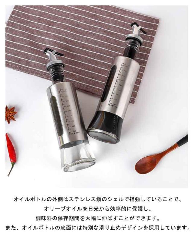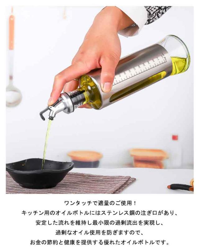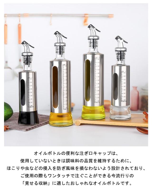 | 2本セット!おしゃれで衛生的な保管!オイルボトルは調味料の液漏れを防止するためにシリコンシールでしっかりと密閉し、衛生面に適した食品グレードの高い素材から作られたオイルボトルです。 オイルボトルの便利な注ぎ口キャップは、使用していないときは調味料の品質を維持するために、ほこりや虫などの侵入を防ぎ風味を損なわないよう設計されており、ご使用の際もワンタッチで注ぐことができる今流行りの「見せる収納」に適したおしゃれなオイルボトルです。 ワンタッチで適量のご使用!キッチン用のオイルボトルにはステンレス鋼の注ぎ口があり、安定した流れを維持し最小限の過剰流出を実現し、過剰なオイル使用を防ぎますので、お金の節約と健康を提供する優れたオイルボトルです。 オイルボトルの外側はステンレス鋼のシェルで補強していることで、オリーブオイルを日光から効率的に保護し、調味料の保存期間を大幅に伸ばすことができます。また、オイルボトルの底面には特別な滑り止めデザインを採用しています。 | |