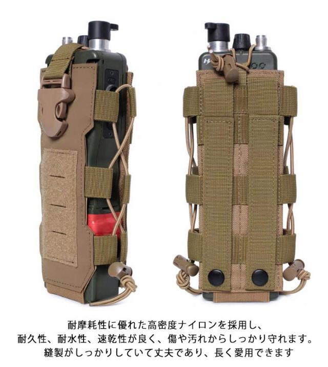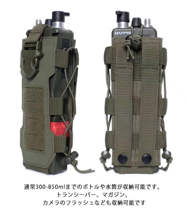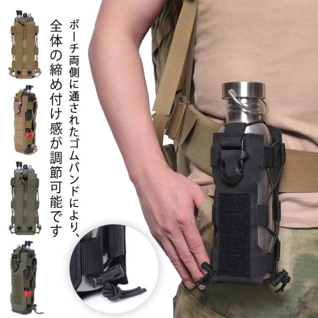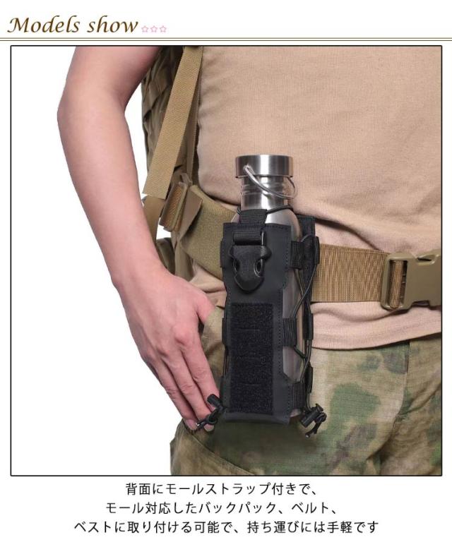| ポーチ両側に通されたゴムバンドにより、全体の締め付け感が調節可能です。 開口はサイズに合わせて調整可能な引き紐になっているので、安定感があります。 背面にモールストラップ付きで、モール対応したバックパック、ベルト、ベストに取り付ける可能で、持ち運びには手軽です。 通常300-850mlまでのボトルや水筒が収納可能です。トランシーバー、マガジン、カメラのフラッシュなども収納可能です。 耐摩耗性に優れた高密度ナイロンを採用し、耐久性、耐水性、速乾性が良く、傷や汚れからしっかり守れます。縫製がしっかりしていて丈夫であり、長く愛用できます。 多用途:サバイバルゲーム、キャンプ、撮影、探検、狩猟、旅行、登山、釣り、部活、ランニングやサイクリングなどのアウトドアにとって、理想的な製品です。 | |
